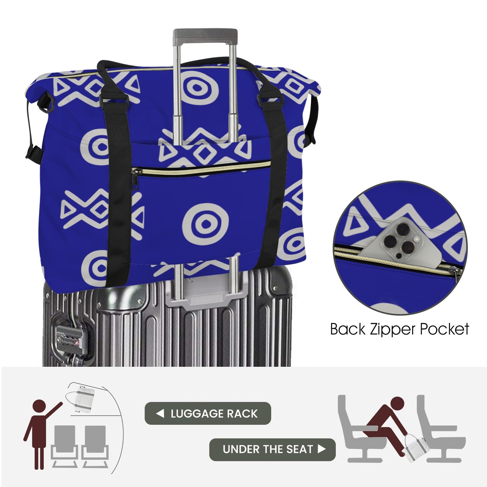 Bold pattern. Serious capacity. The Savanna Indigo Duffle Bag is designed for movement—weekends away, gym sessions, carry-on travel, and everyday hustle. Featuring a striking indigo geometric print inspired by African symbolism, this bag blends cultural expression with modern utility.