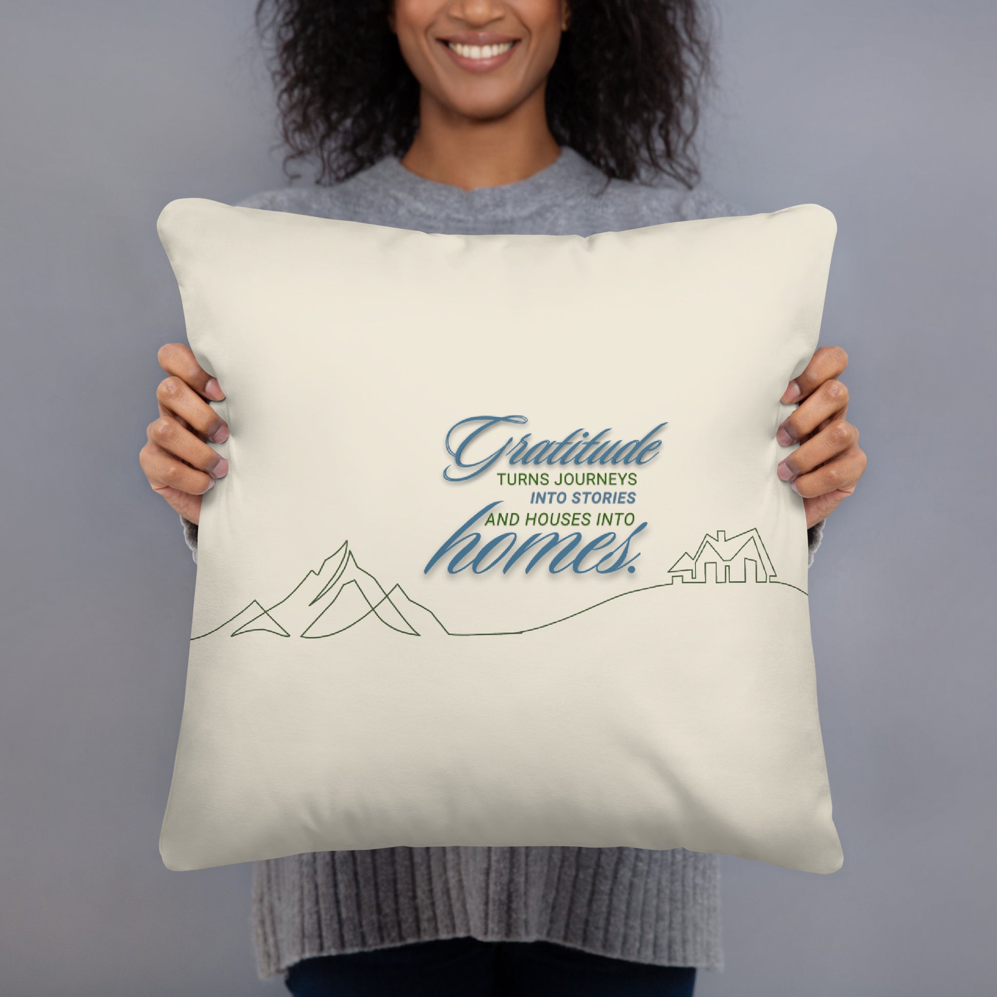 Add warmth and inspiration to your home with the Gratitude Throw Pillow Collection. Each pillow is designed with calming natural motifs and the uplifting quote: "Gratitude turns journeys into stories and houses into homes." More than just décor, these pillows serve as daily reminders of mindfulness, thankfulness, and peace.