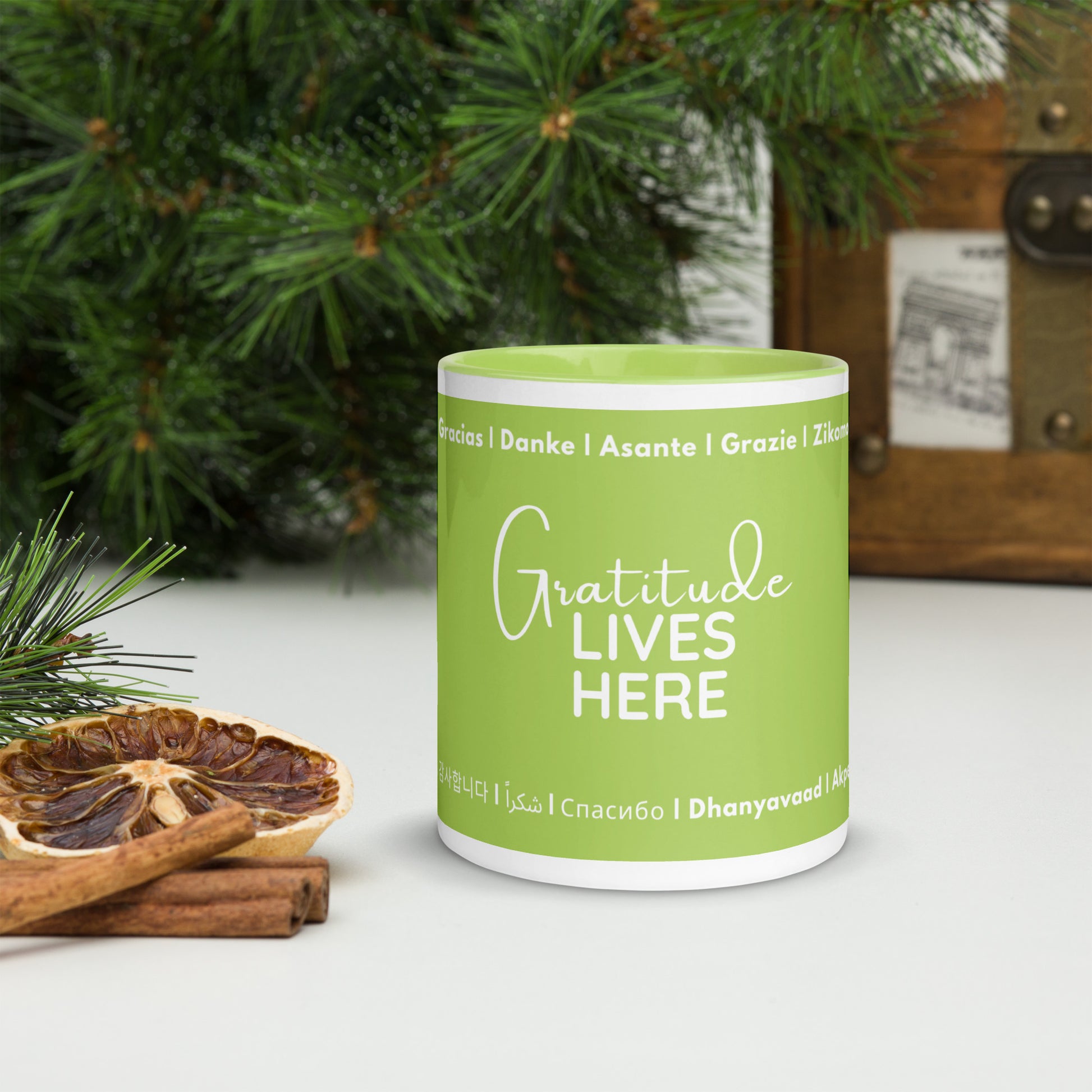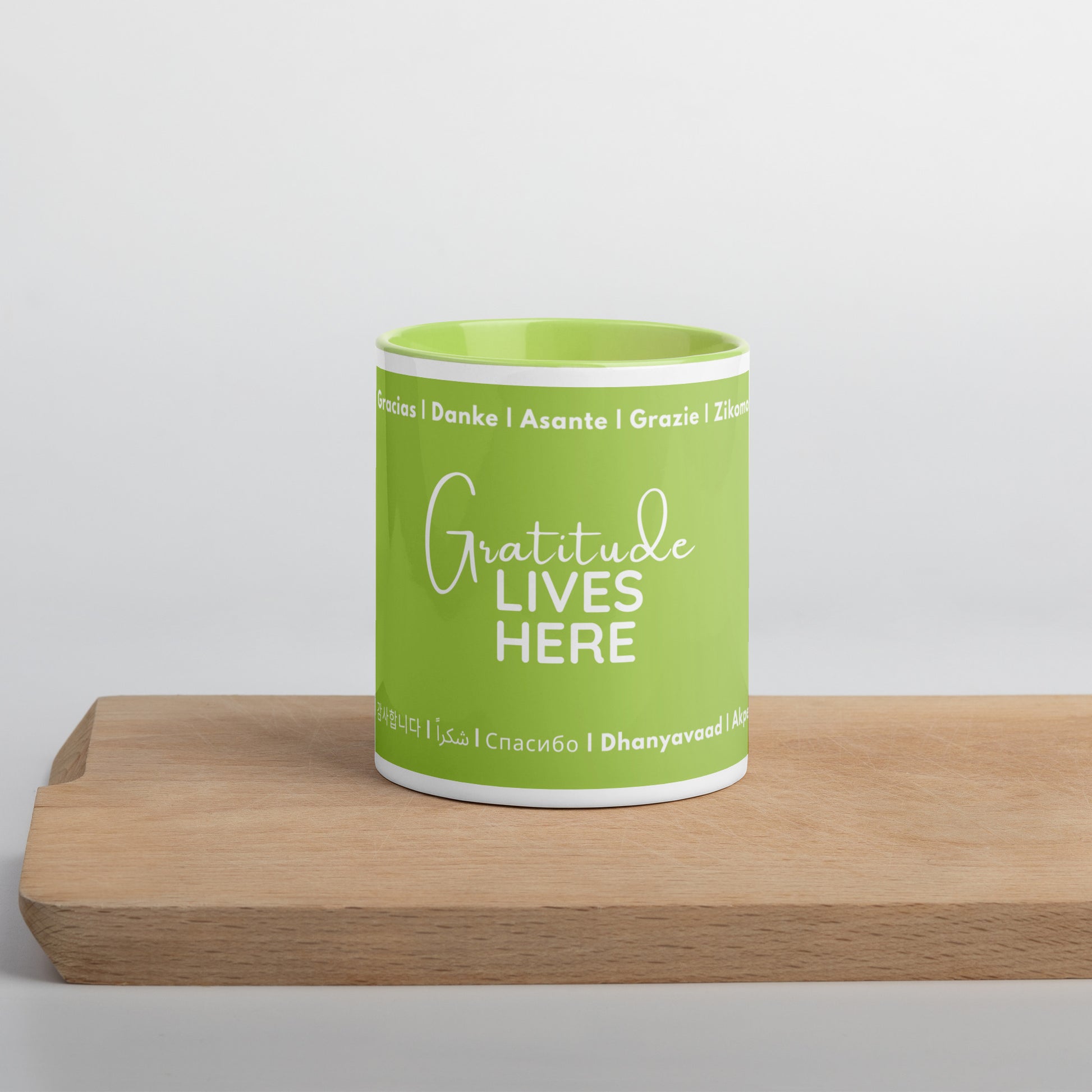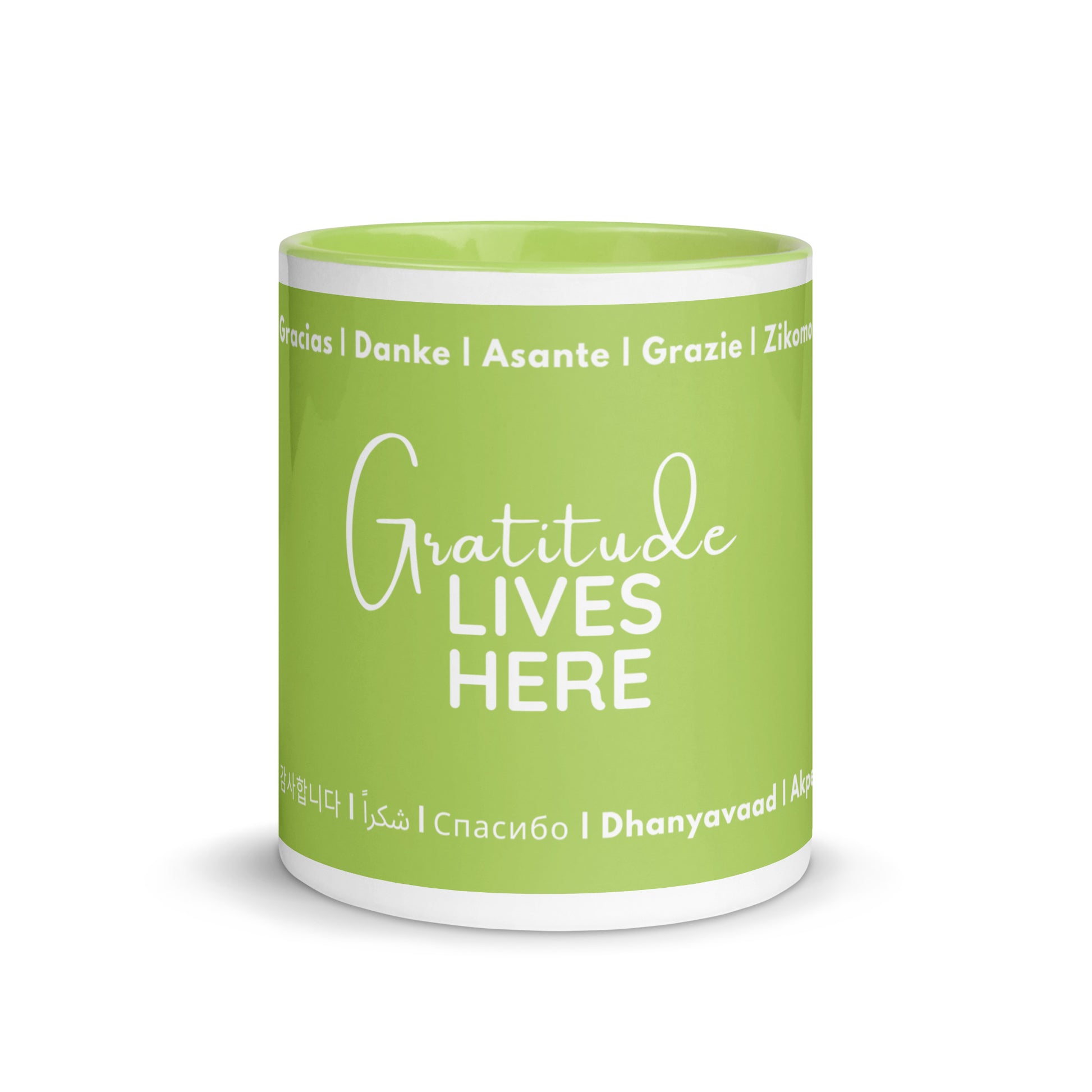 - Gratitude Lives Here (Lime Green) – A joyful celebration of thankfulness, printed with “Gracias,” “Asante,” and “Dhanyavaad” around the rim to remind us gratitude is a universal language.