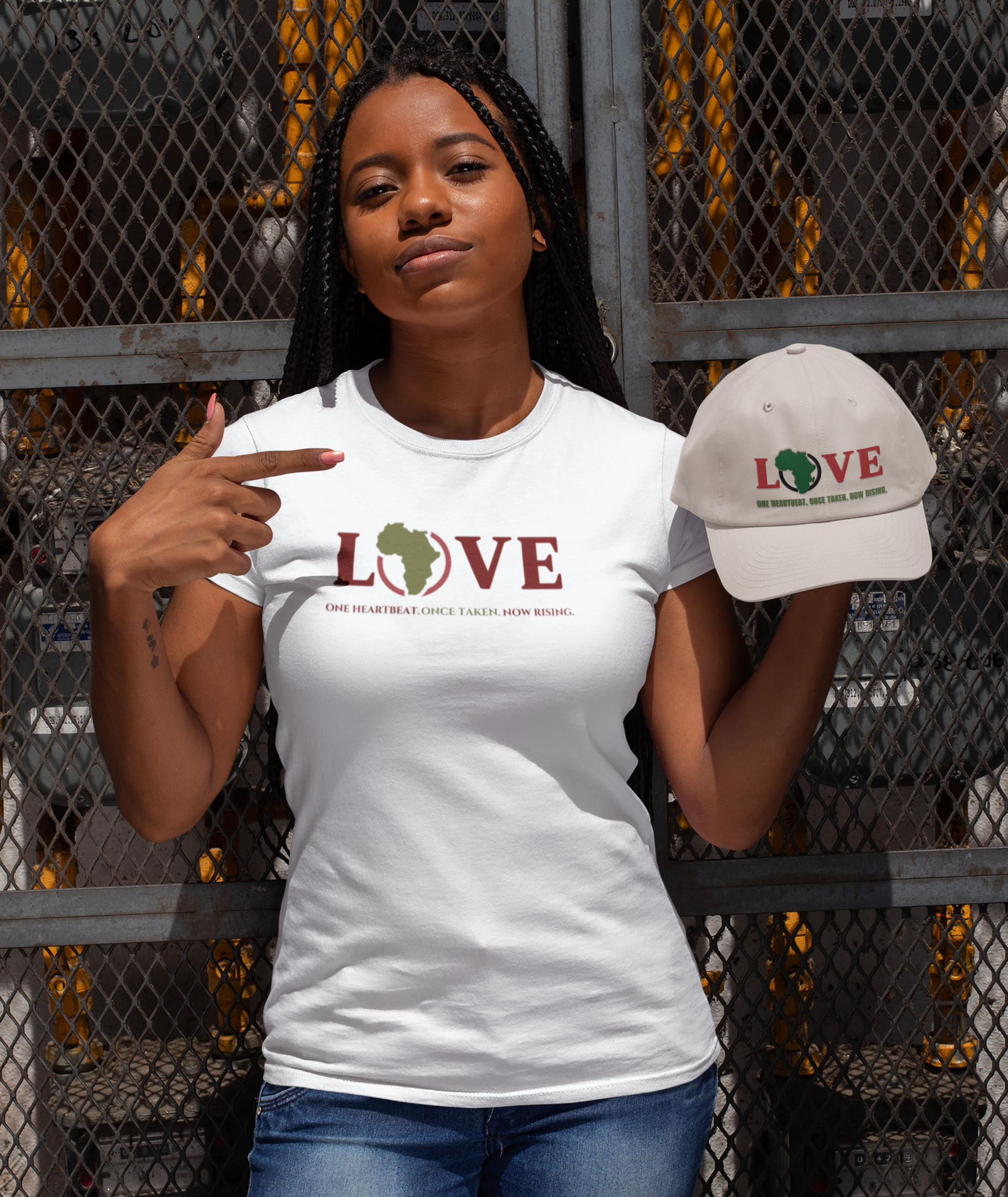 - Bold embroidery: “Love Africa – One Heartbeat” design honoring resilience