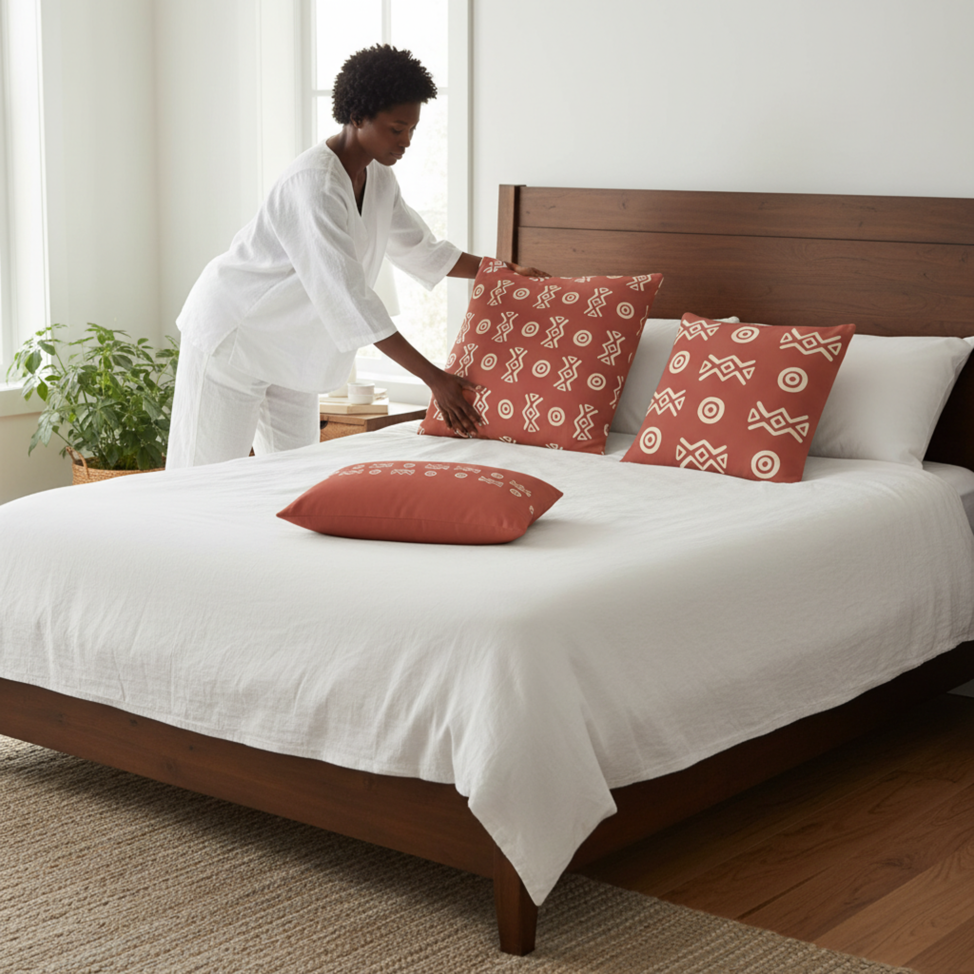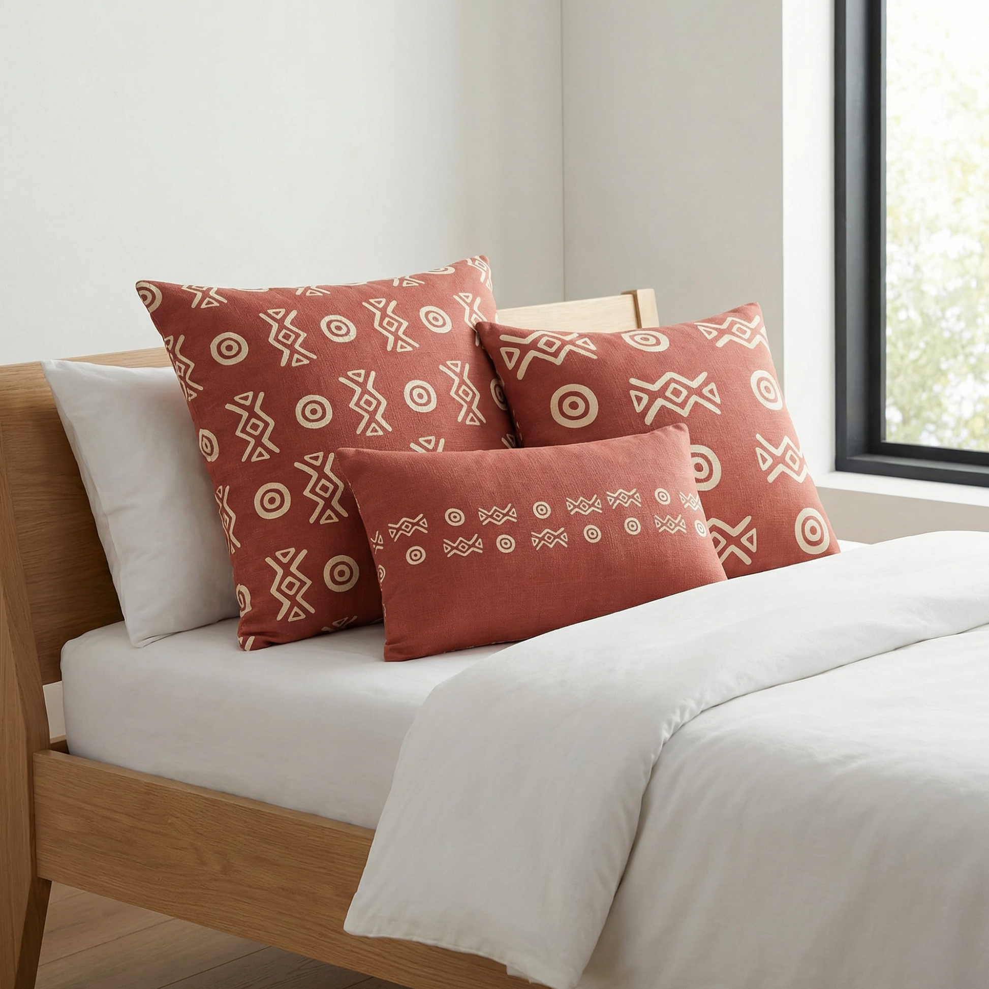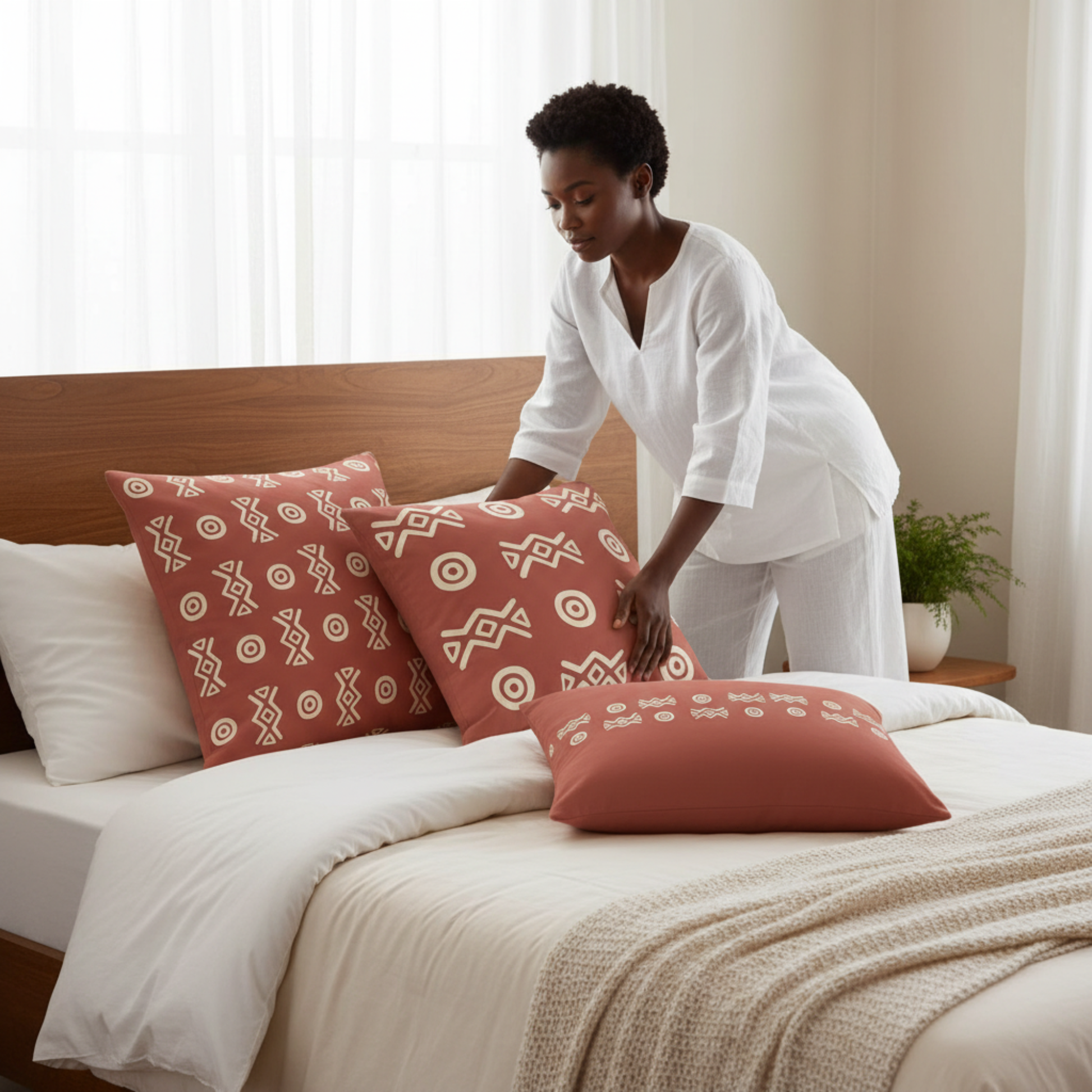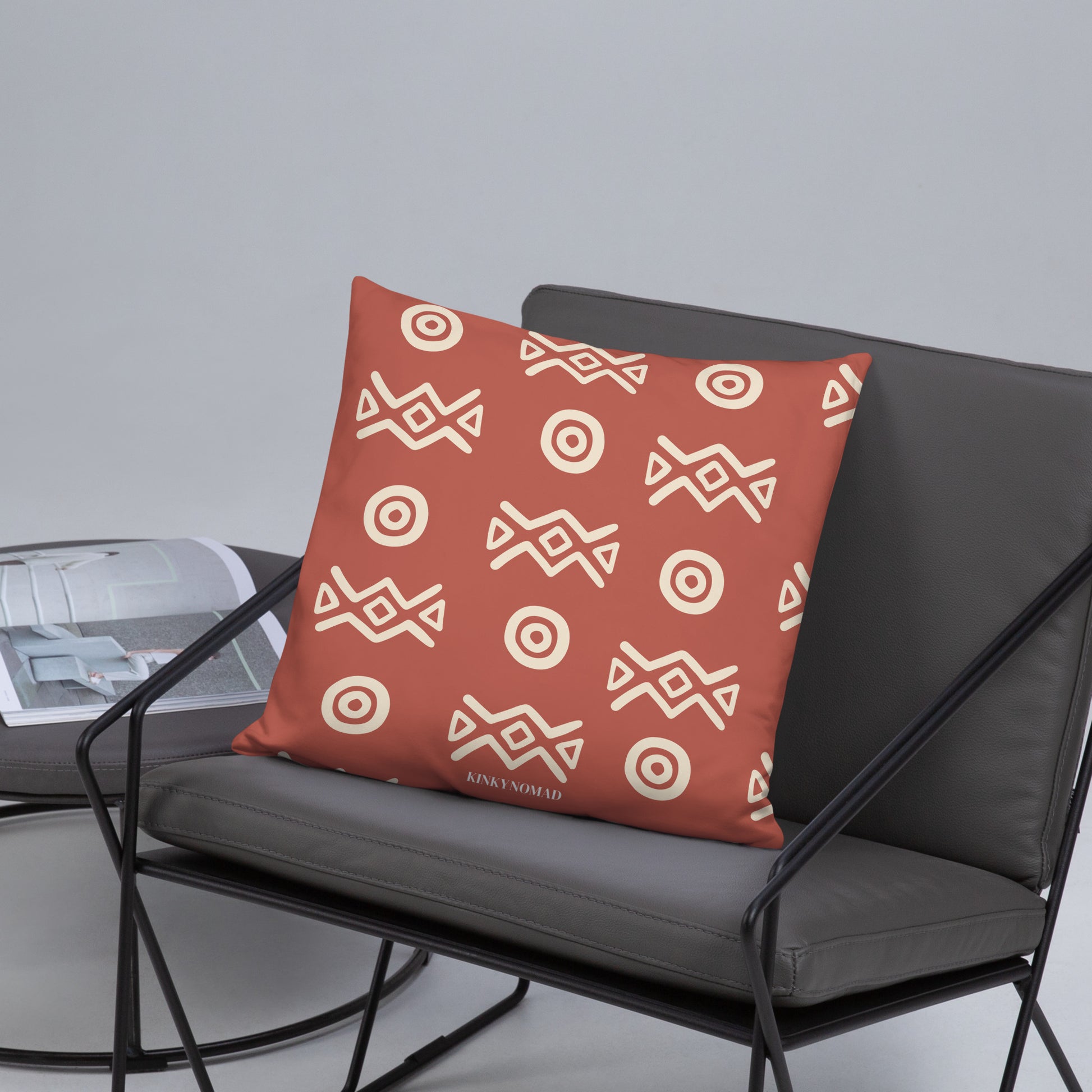 Bring grounded warmth and ancestral rhythm into your home. The Savannah Earth pillows feature Kinky Nomad’s signature geometric pattern in rich terracotta clay tones — a design inspired by the timeless visual language of African textiles, pottery, and sacred symbols.